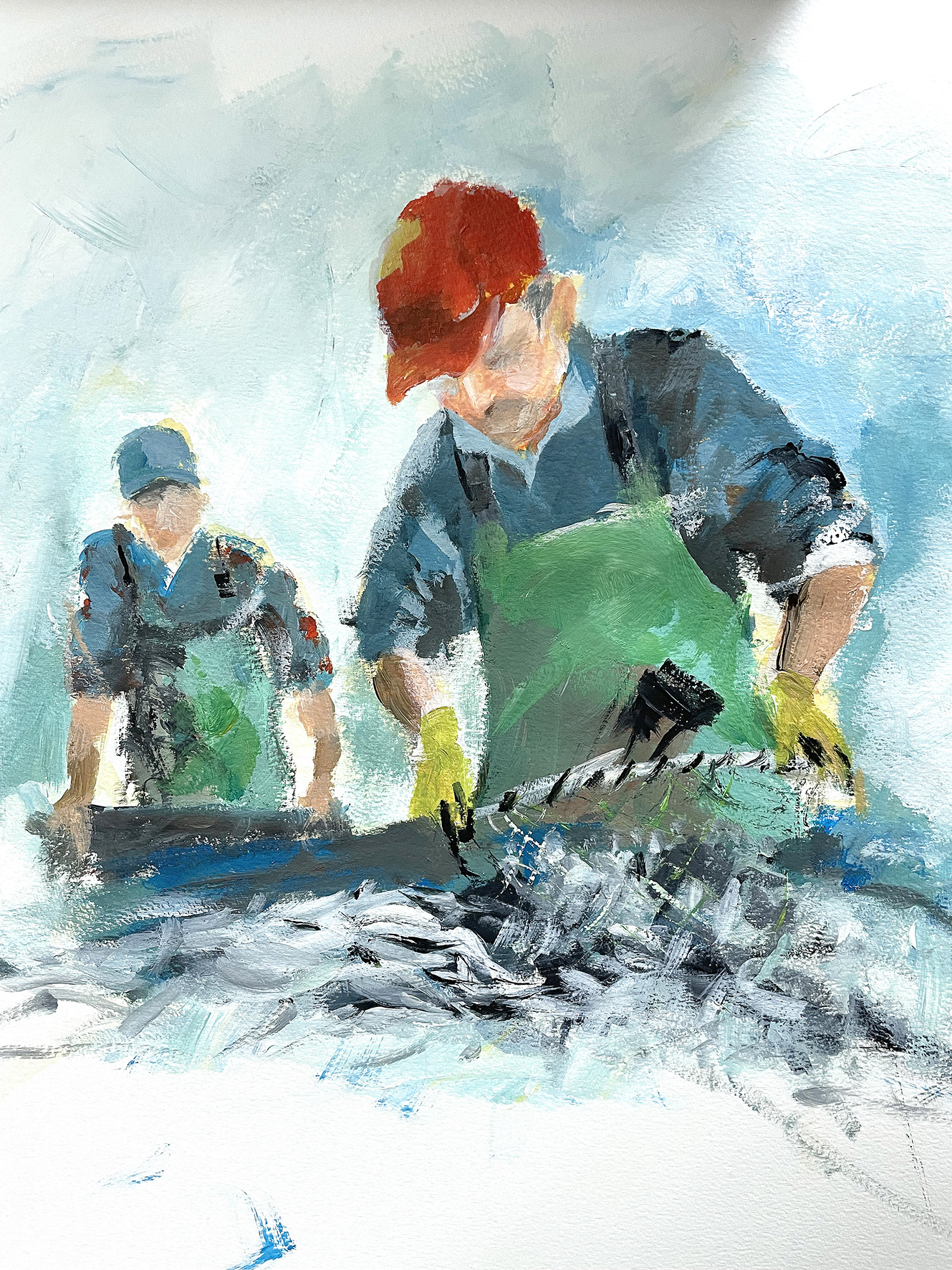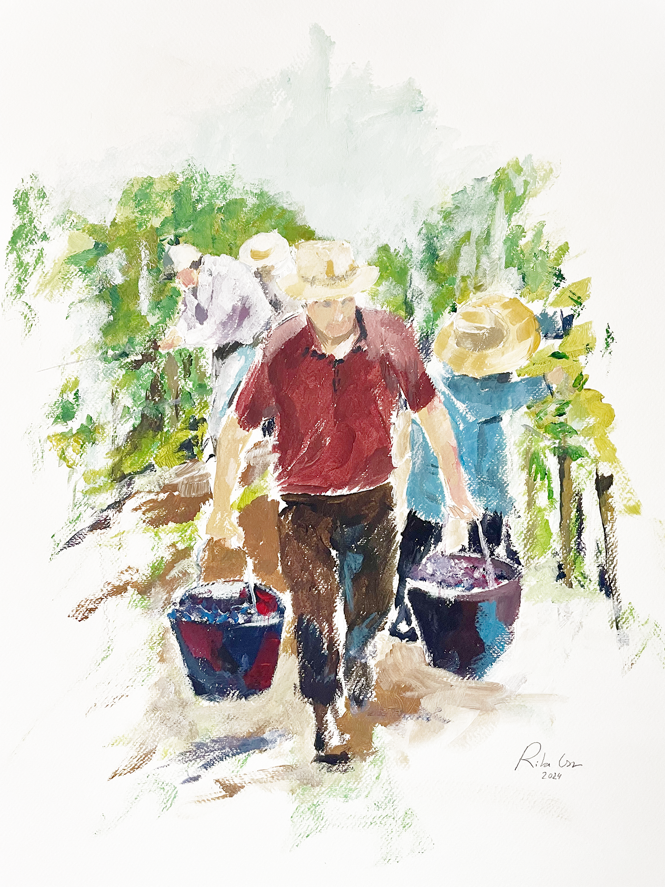 Dividida em três temáticas, “Vivências” convida a percorrer caminhos de intimidade, memória e ligação ao que nos define, as nossas raízes, as nossas gentes, os lugares a que chamamos casa. No primeiro tema, as relações humanas ganham cor e forma, inspiradas por versos, emoções, encontros, ausências e gestos. No segundo, as vinhas ganham vida em cenas de vindima, com homens e mulheres entre cachos e cestos, mostrando o trabalho, o ciclo da terra e a tradição. Por fim, o mar, onde surgem os apontamentos da vida dos pescadores, varinas e momentos junto ao mar.