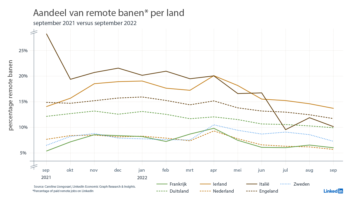 LinkedIn-data toont dat remote werken over zijn hoogtepunt is en dat het aandeel vacatures voor banen op afstand is gedaald in Nederland.