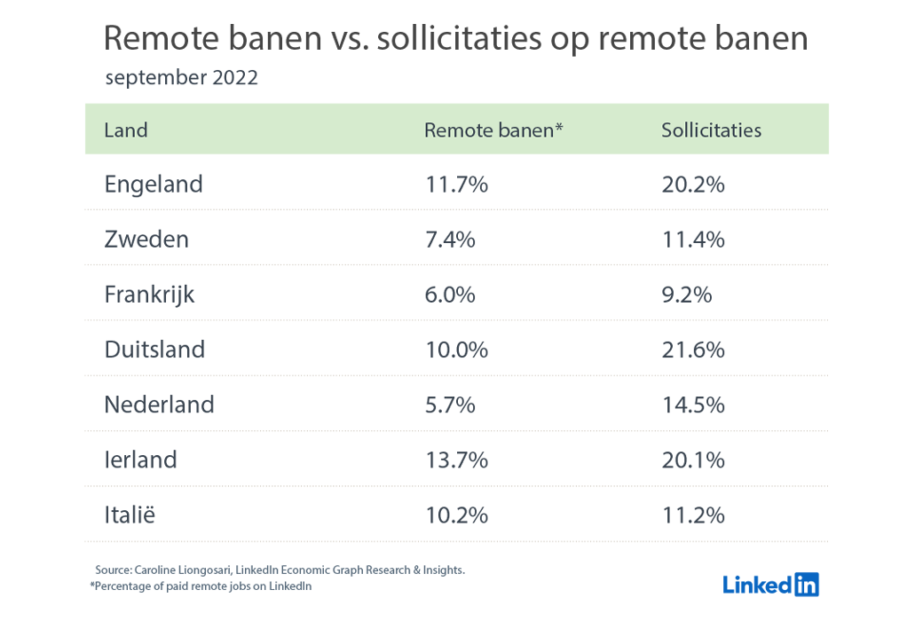 Een opvallende trend, aangezien LinkedIn’s data-analyse tegelijkertijd aantoont dat professionals zelf juist niet terug willen keren naar ‘de oude manier’ van werken. In veel landen, waaronder Nederland, overtreft het aandeel sollicitaties voor betaalde functies op afstand het aanbod van deze functies ruimschoots. In september 2022 was het aandeel betaalde remote vacatures in Nederland 5,7% ten opzichte van het totale aantal vacatures, terwijl het aandeel sollicitaties op deze vacatures 14,5% was.