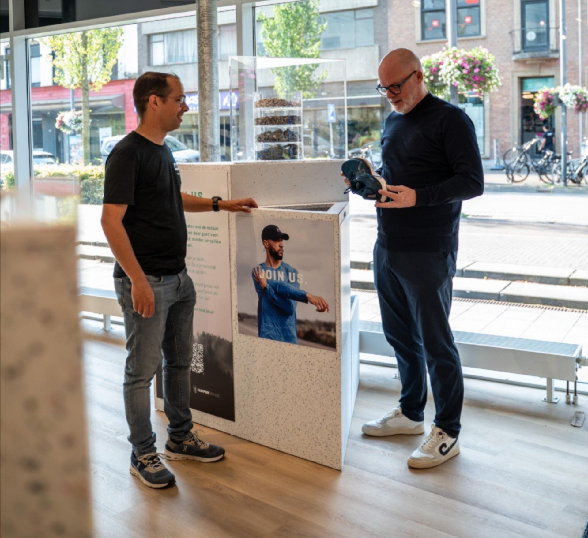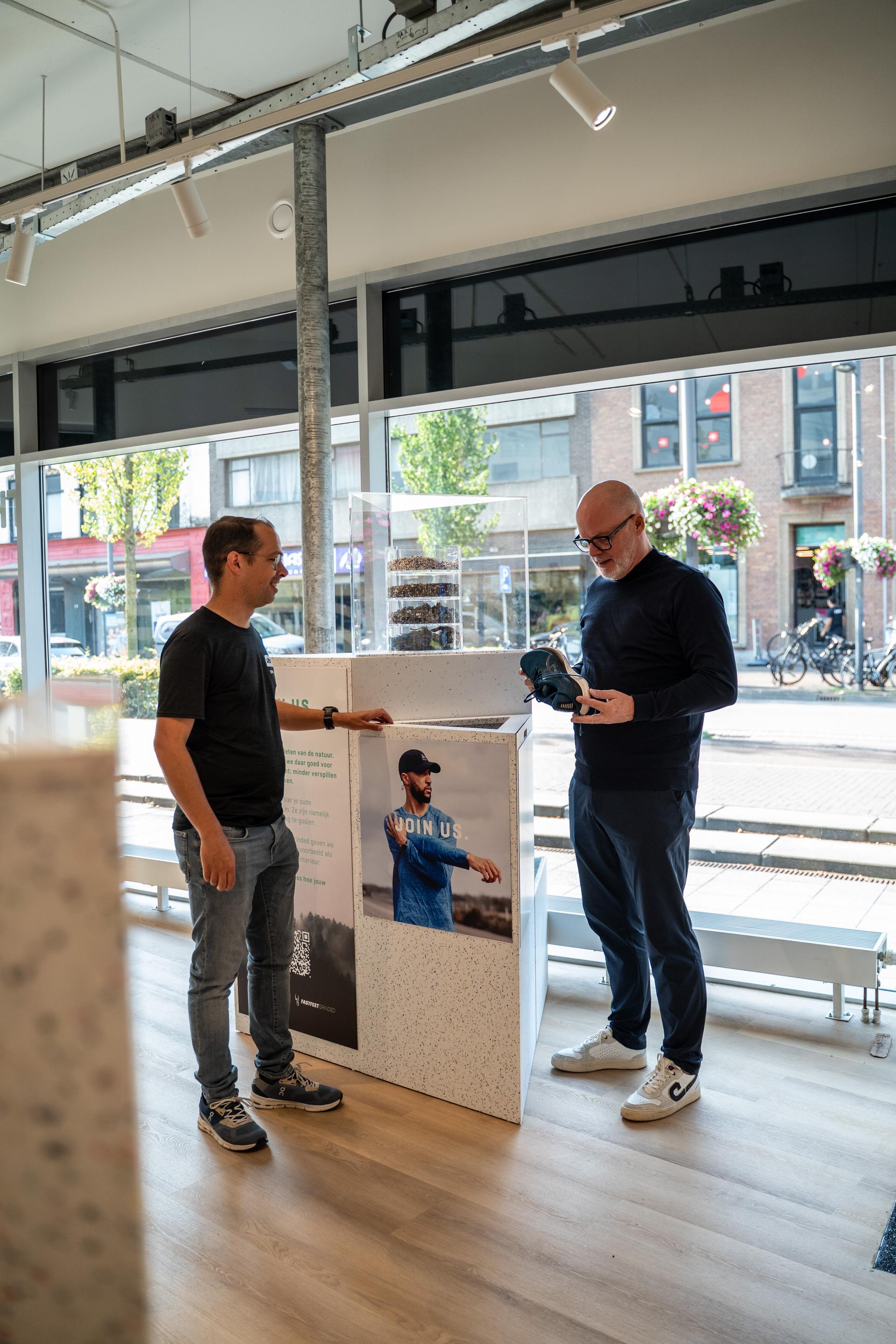 Het resultaat is te zien in Eindhoven. “We zijn de eerste sportwinkel in Nederland waar onze klanten hun eigen ingeleverde schoenen terugzien in de winkelinrichting”, zegt Danny Pormes, eigenaar van de Runnersworld-vestiging in Hoorn en tevens oprichter van FastFeetGrinded. Het nieuwe winkelconcept heet The Loop (de kringloop).