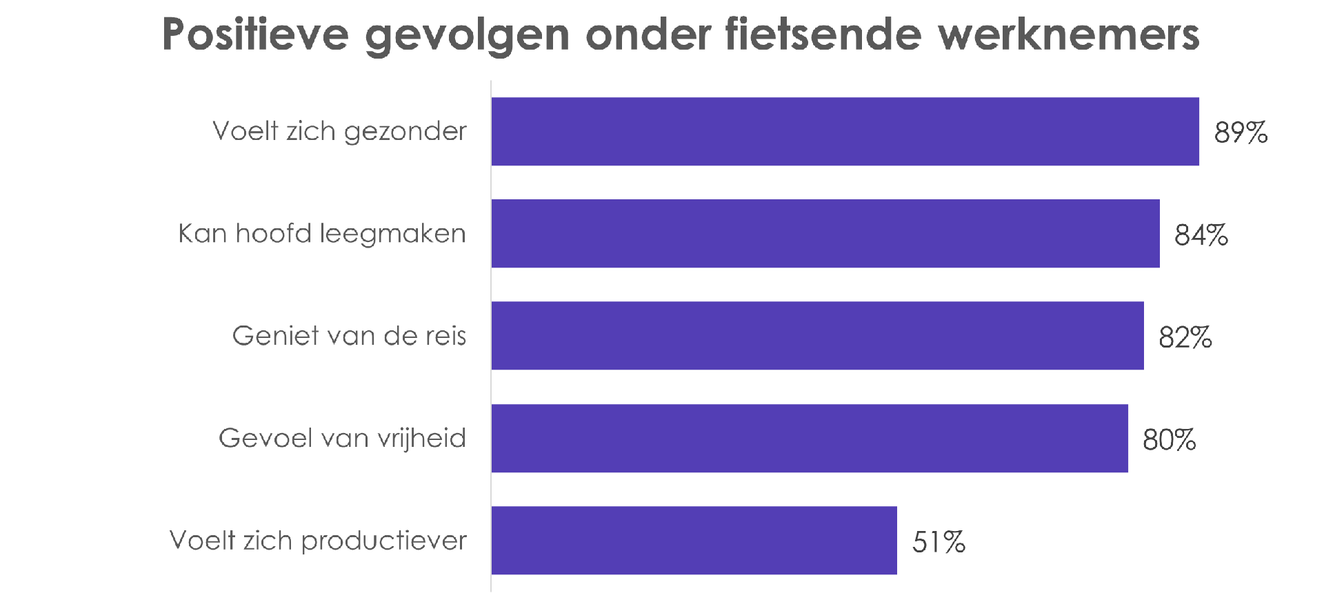 Ook forensen die niet fietsen verwachten deze positieve gevolgen te ervaren als zij zouden gaan fietsen, met name op het gebied van een gezond gevoel, het kunnen leegmaken van het hoofd en de boost voor je productiviteit. Of er met de gewone fiets of een e-bike gereden zou worden, maakt in die verwachting geen verschil. In het licht van deze verwachtingen is het begrijpelijk dat maar liefst 48% van de Nederlanders in het geval van een nieuwe baan (ook) op de fiets naar het wil kunnen.