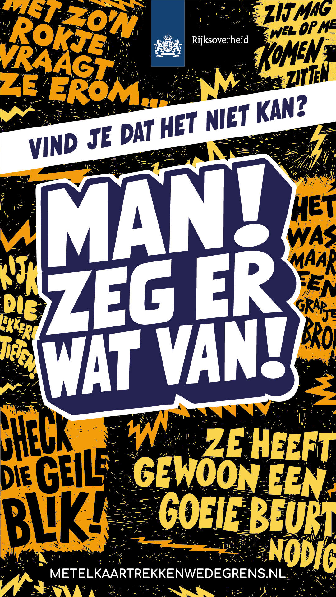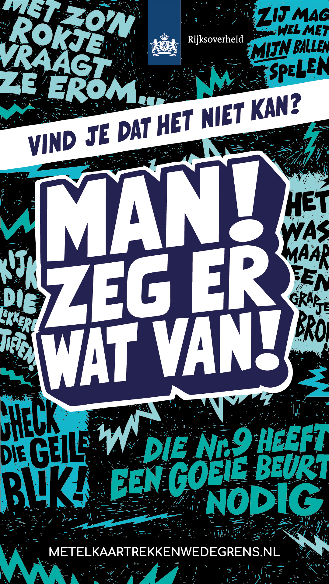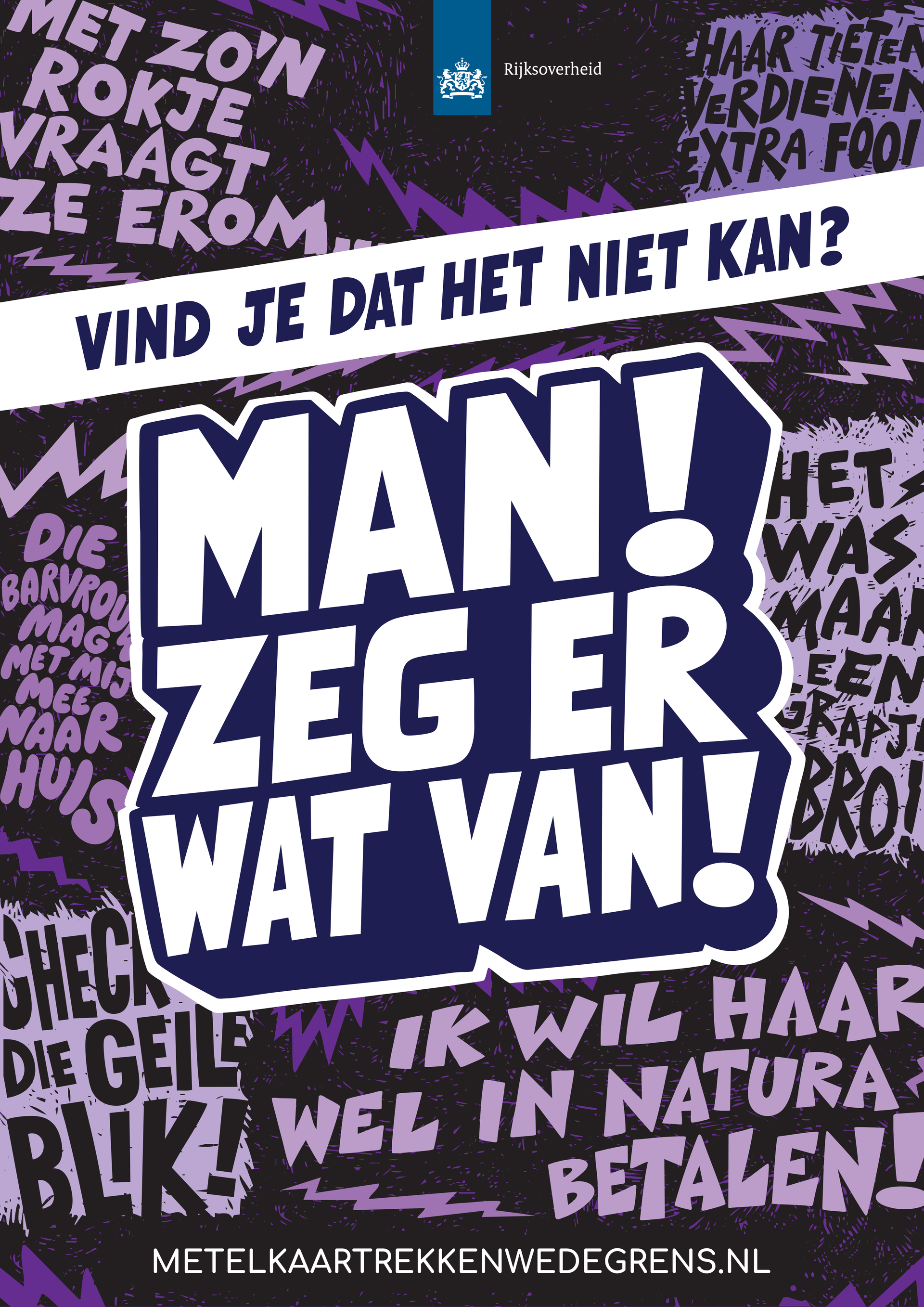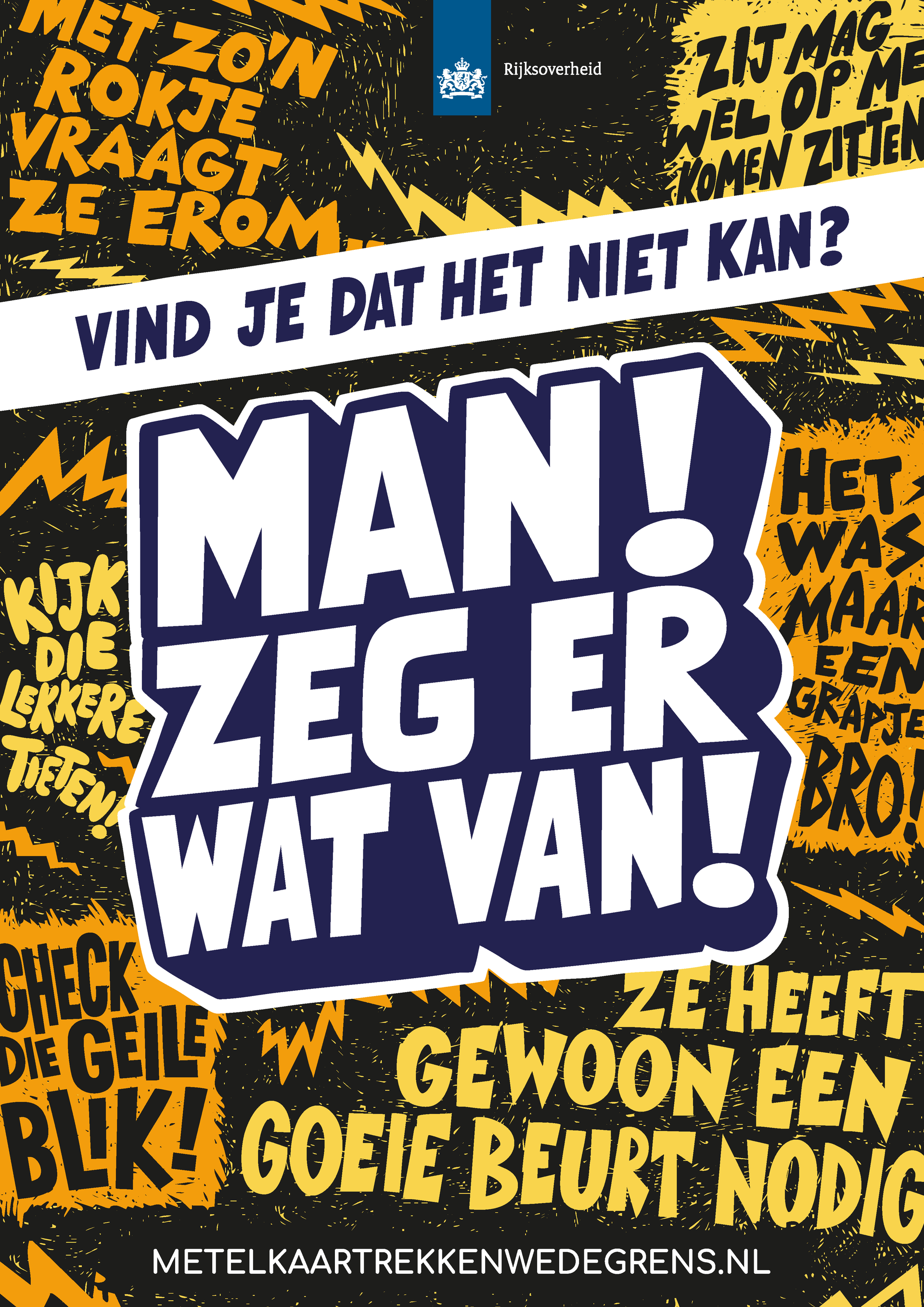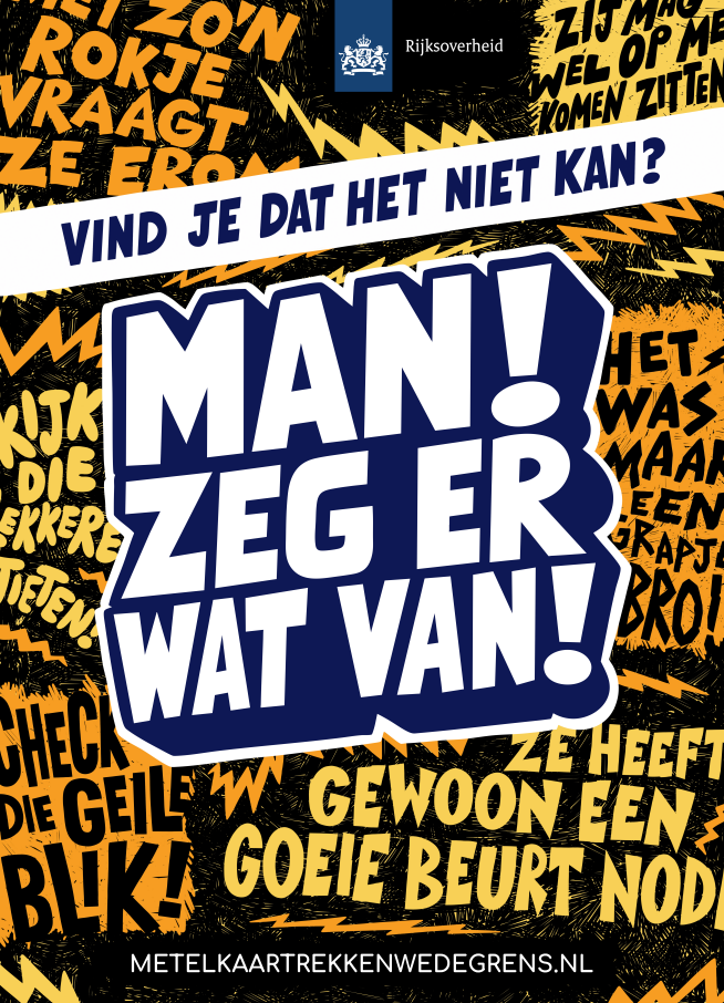 Met de campagne 'Man, zeg er wat van!' wil de Rijksoverheid mannen motiveren om andere mannen in hun sociale kring (zoals vrienden, collega’s of sportteamgenoten) aan te spreken op seksueel grensoverschrijdend gedrag richting vrouwen.