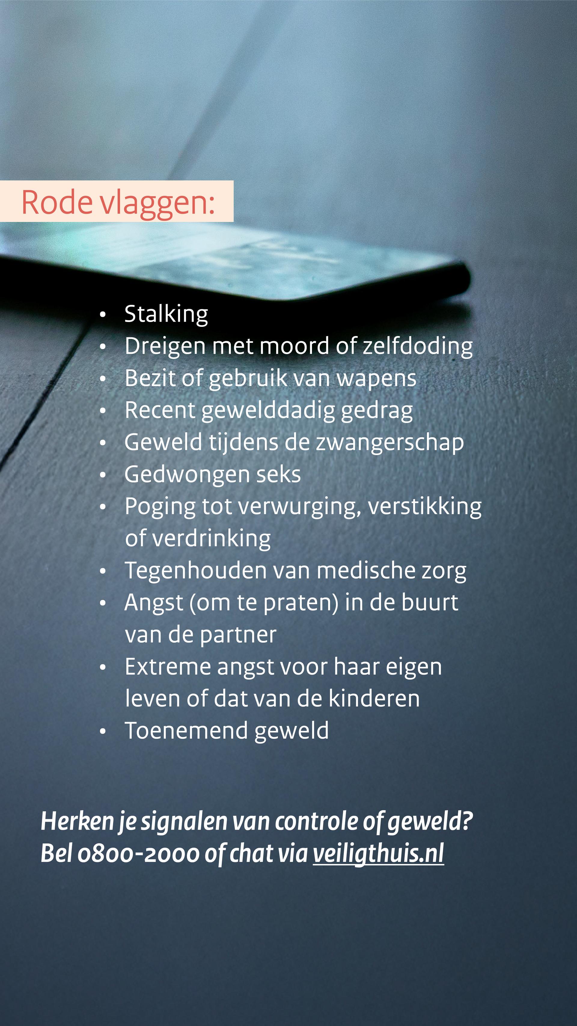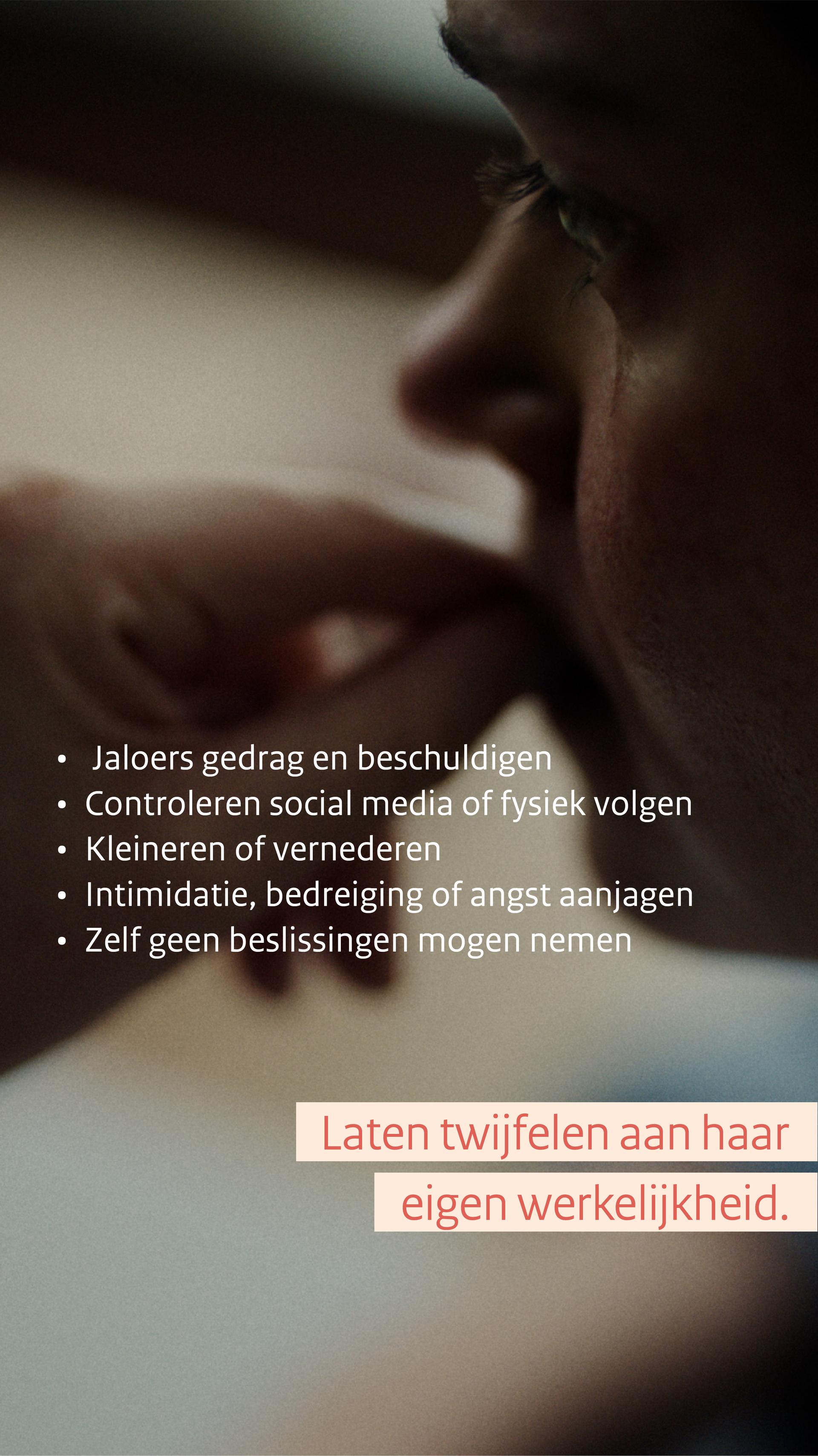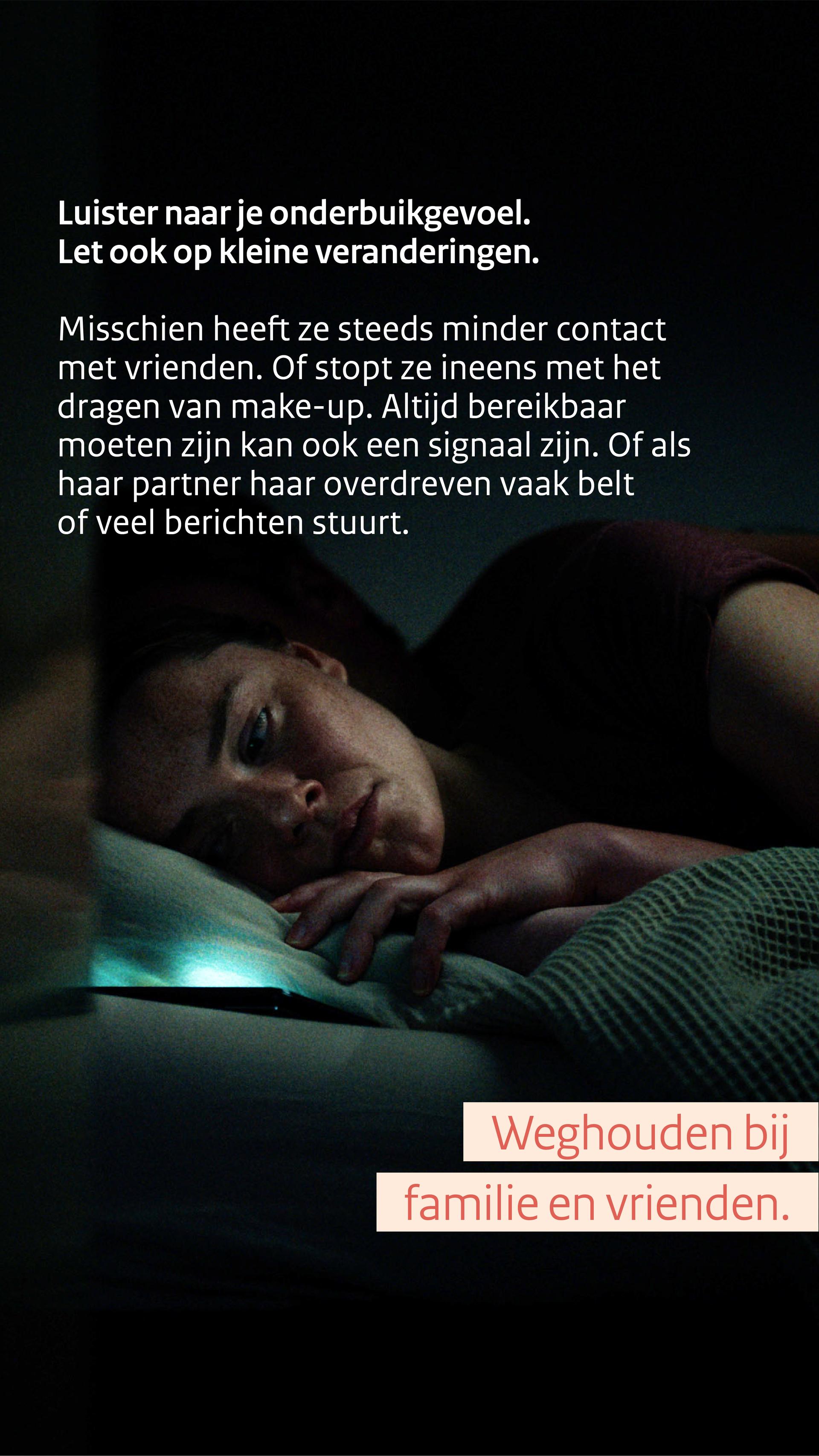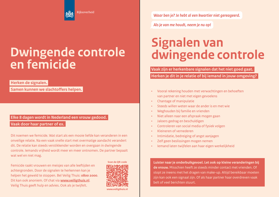 Voor de campagne is een folder gemaakt. Deze folder geeft o.a. informatie over de signalen van dwingende controle. Je kunt de folder digitaal of via print verspreiden op locaties zoals wachtkamers, balies of tijdens bijeenkomsten. De folder is in 11 talen beschikbaar: Nederlands, Engels, Arabisch, Chinees, Duits, Spaans, Frans, Pools, Portugees, Roemeens en Turks. |