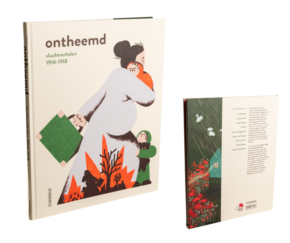 In het nieuwe boek ‘Ontheemd, vluchtverhalen 1914–1918’ bundelen museummedewerkers Pieter Trogh en Annick Vandenbilcke vijfentwintig aangrijpende vluchtverhalen uit de Eerste Wereldoorlog. Het zijn persoonlijke getuigenissen die symbool staan voor de vele duizenden andere, vaak ongehoorde verhalen. Ze worden indringend zichtbaar gemaakt door negen illustratoren. Het boek is het resultaat van jarenlang verzamelen, onderzoeken en documenteren van familiegeschiedenissen en vluchtervaringen.