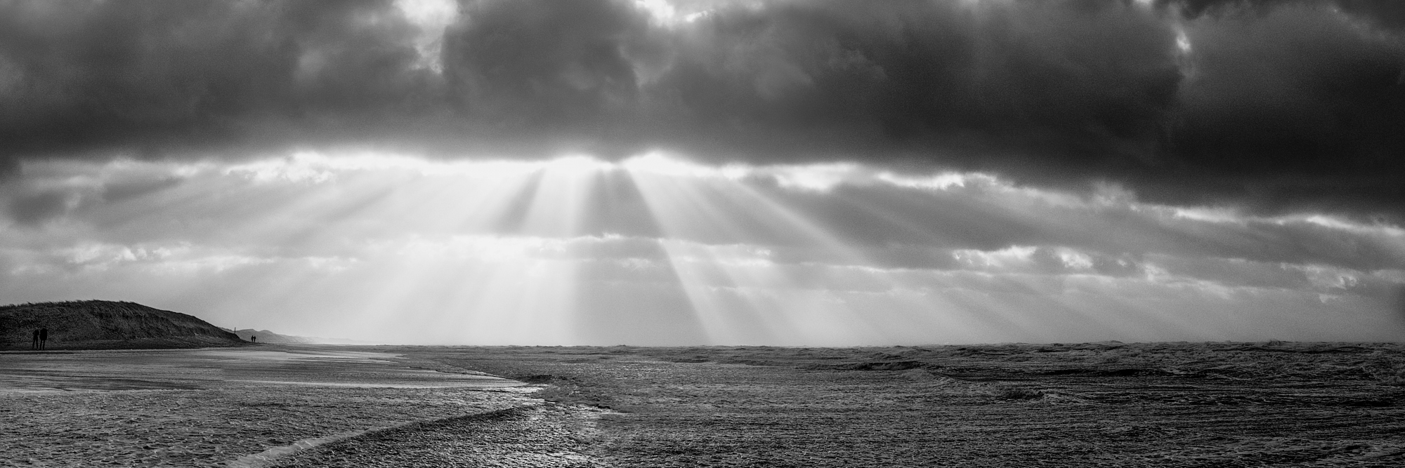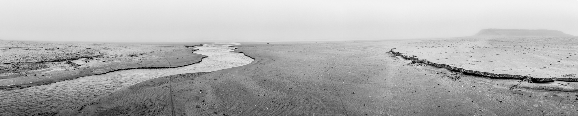 Time & Tide toont een reeks zwart-wit foto’s van de Nederlandse kust. Swart gebruikt een speciale techniek: elk panoramabeeld is opgebouwd uit verschillende foto’s die zijn samengesteld tot één beeld.